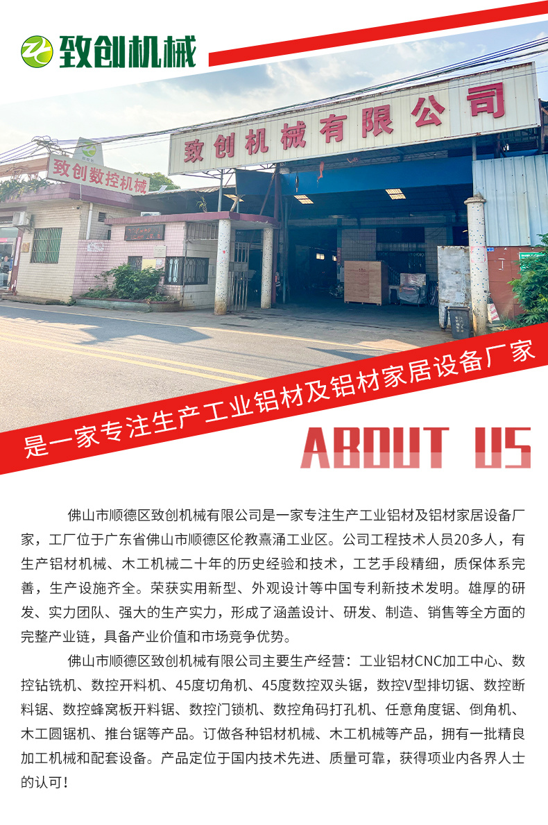 公司主要生产经营:工业铝材CNC加工中心、数控钻铣机、数控开料机、45度切角机、45度/90度数控双头锯,数控V型排切锯、数控断料锯、数控蜂窝板开料锯、数控门锁机、任意角度锯、木工圆锯机、精密推台锯等产品。